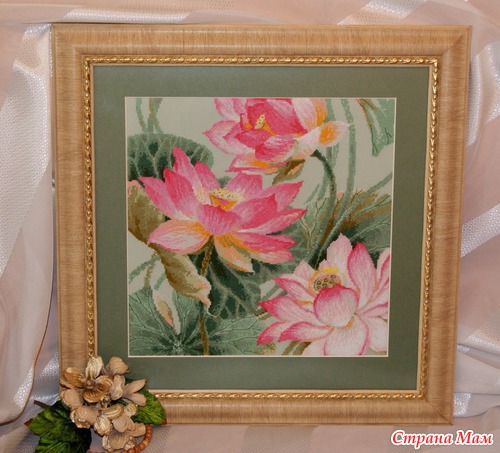 Хочется показать мою новую картинку - "Лотосы". Набор кажется только в прошлом году появился в продаже. Вышивала по набору. Вышивается в основном всё крестиком, используется бисер (3 вида). Размер оформленной работы 52,5х52,5 см