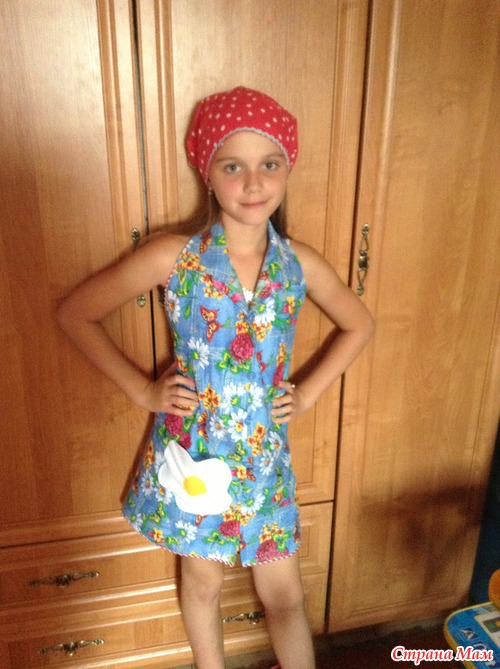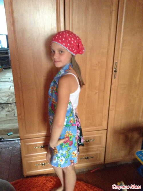 и напомнила мне доченька перед занятием-пришлось быстренько состряпать фартучек и косынку, но я не могу делать простых вещей-поэтому порыскав в инете для вдохновения я сшила следущее: