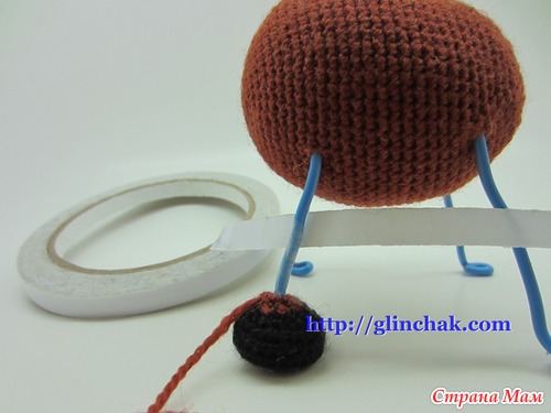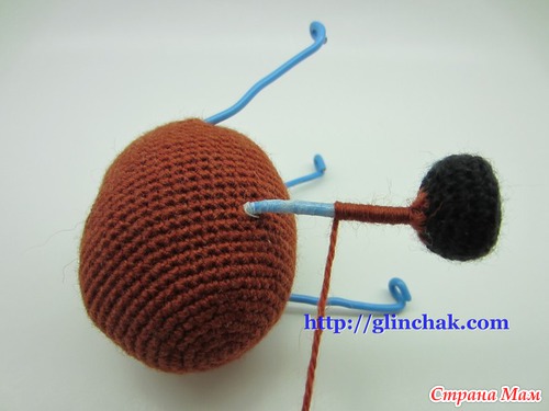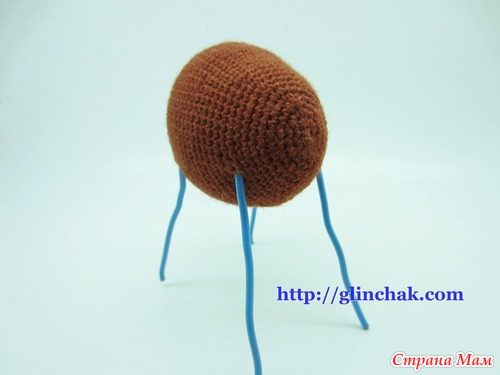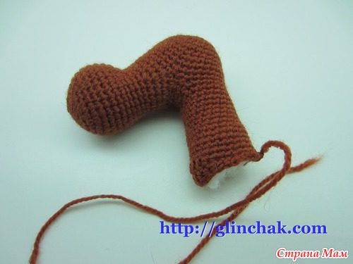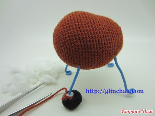 После двух или трех убавлений 9го ряда, вставить каркас и наполнить копыто, распределяя наполнитель равномерно вокруг каркаса.