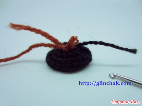 Причем после первого выполненного убавления, отрезать нить, которой вязалось копытцо и завязать крепко на два узелка этот кончик вместе с кончиком нити нового цвета.