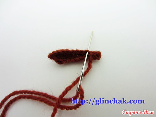 Пришиваем детали –один короткий стежок за туловище, один за ближнюю к нам стенку косички, шов прокладываем по аналогии со шнуровкой, хорошенько затягивая каждый стежок.
