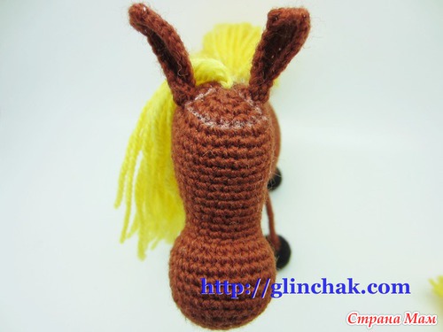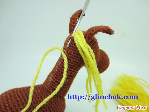 Начиная от ушей, прикрепите несколько нитей, втыкая крючок в том же направлении, в каком втыкали для гривы – эти пряди направьте за уши.