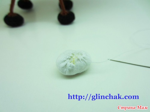 Закрепляем нить, продев её с помощью иглы несколько раз через туловище. Нить слегка натянув отрезаем – кончик утонет навсегда в наполненной детали.