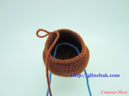 11р. Цепочка из 10Вп – перемычка, крючок воткнуть в 19ю петлю по кругу,15Сбн, дойдя до цепочки, 10Сбн(по 1Сбн в каждую петлю цепочки, за заднюю стенку косички)=25