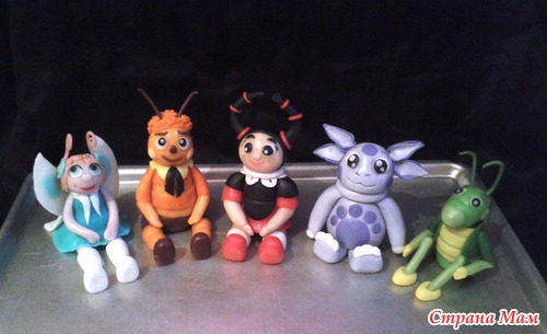 . Оказалось лепить эту компанию не так уж сложно, чем представляла себе. Лунтик вышел не очень аккуратный (долго я его мучила), бабочку уже делала из последних сил (и в самую последнюю очередь), поэтому она такая страшненькая получилась, крылья кривые... Вообщем смотрите сами:Фигурки у меня получились большие (где-то 9 см), на торт я их с трудом усадила и закрепила. Девочки, а какой высоты у вас фигурки? Или вы их лепите в зависимости от размера торта? У меня никогда маленькие не получаются (либо торт у меня маленький).