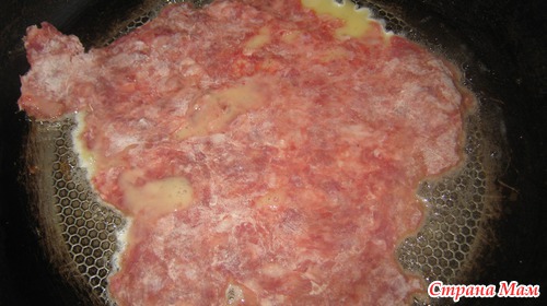 5. Аккуратно сдвигаем яйцо с фаршем с тарелки в нагретую сковороду с маслом.
