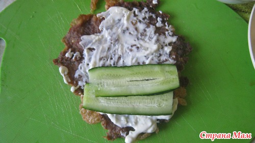 7. Сверху ложим огурец и заворачиваем.