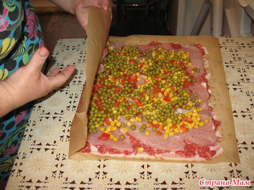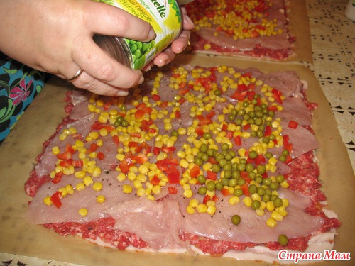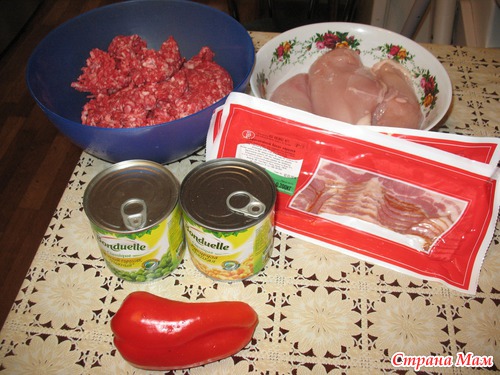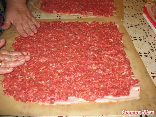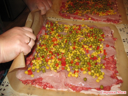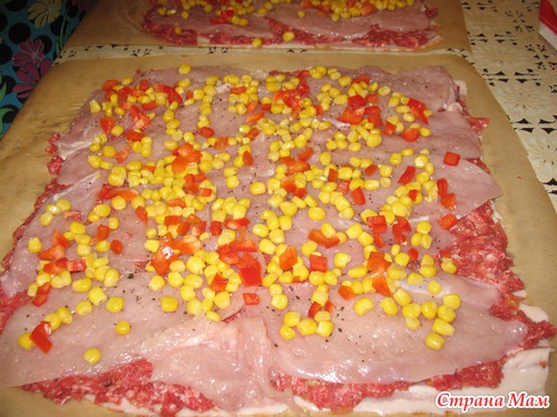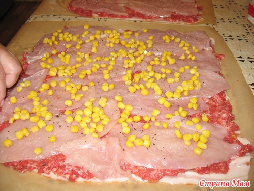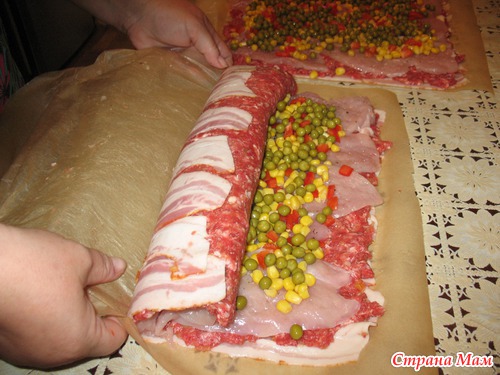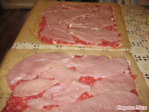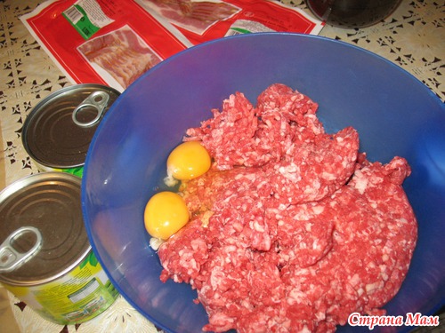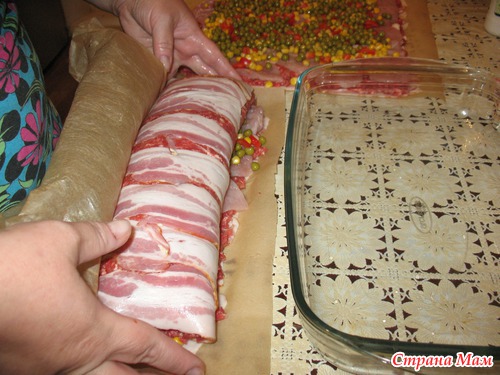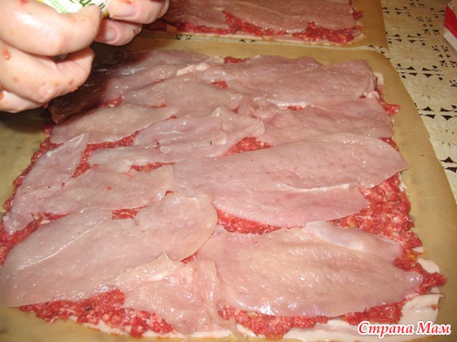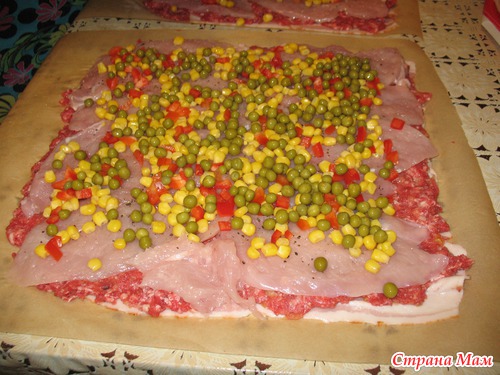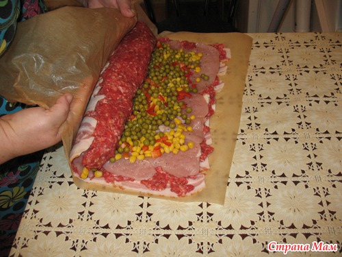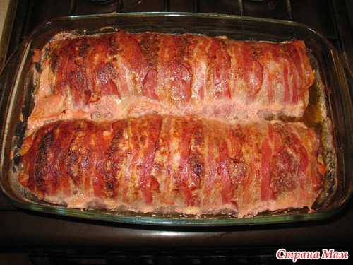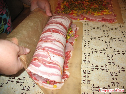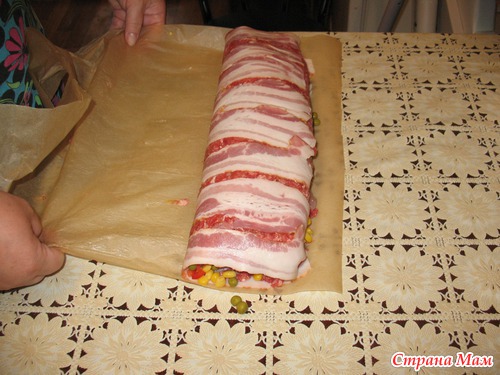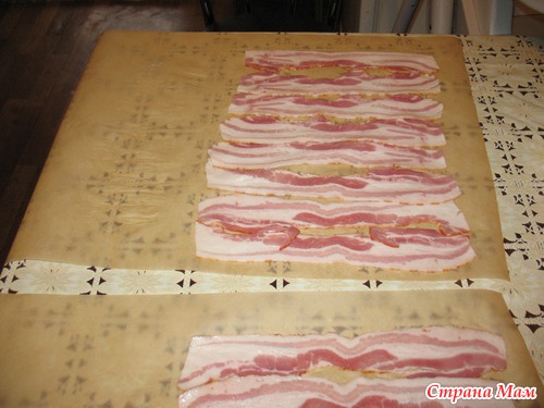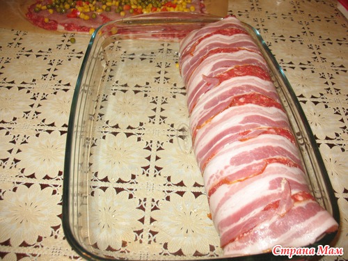 на бекон тонким слоем фарш. Но так, что бы как следует закрыть весь бекон