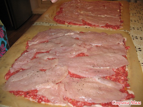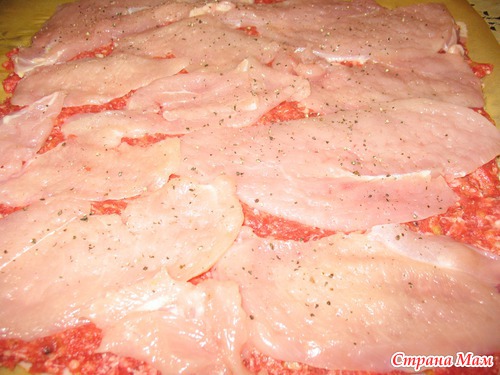 - 4 филе грудки курицы (каждый кусочек был разрезан на 4-5 пластиков и отбит);