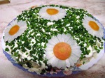 Сверху натереть морковь, на терке, на крупных отверстиях. На морковь натереть картофель. Сверху майонез, зелёный лук, или зелень. Украсить ромашками и поставить в холодильник минимум на 2 часа.