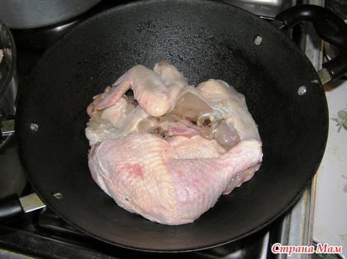 Курицу режем на порционные кусочки и укладываем в казан или кастрюлю. Лучше конечно курицу резать помельче, а не так как я порезала.