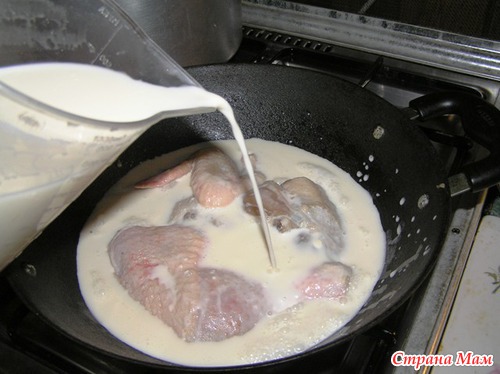 Обратите внимание - мы курицу не обжариваем, не солим и не перчим. Просто укладываем в кастрюлю, и заливаем разбавленной водой сметаной.