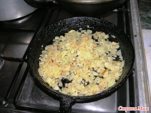 Тем временем режем лук и обжариваем его на сливочном масле до золотистого цвета.