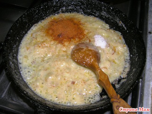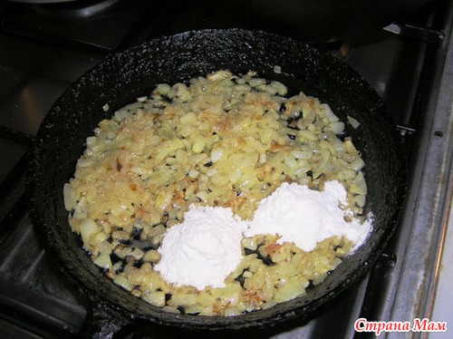 Добавляем в обжаренный лук 2 столовых ложки муки, 1 чайную ложку соли, приправу для курицы.