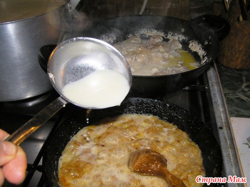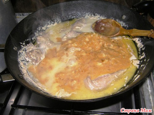 Затем сметану разбавляем водой, и выливаем ее на курицу.