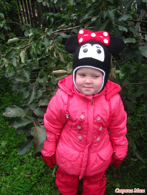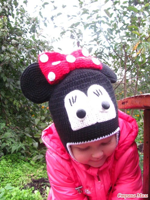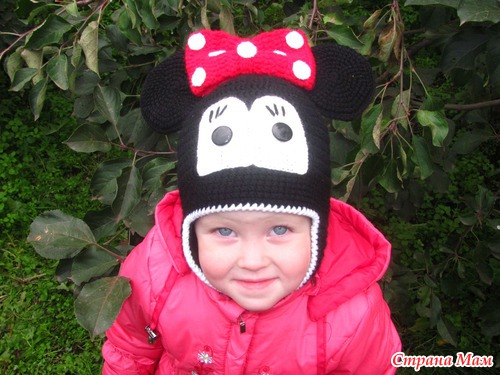 и ботинки в том числе. Вот и решила я, что нужно связать шапочку, в которой будет красный цвет, но он будет не основным. Так долго думая, я решила, что это будет Минни Маус.
