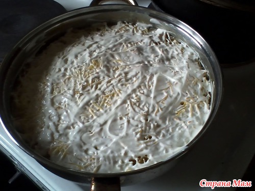 Потом заливку как положено: молоко, яйца и сметана и 3 яйца.