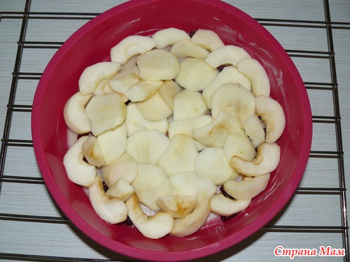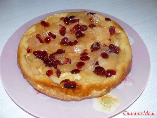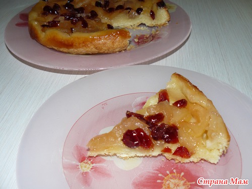 Насыпаем немного сушеной клюквы (можно и без нее), выкладываем кусочки яблок внахлест: