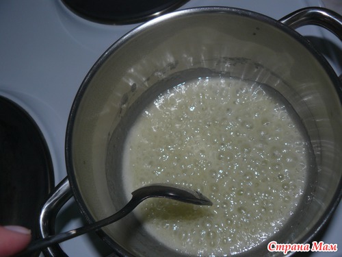 Масло, сахар и воду растопить в кастрюльке и варить, постоянно помешивая, до кремового цвета. Это начало варки:
