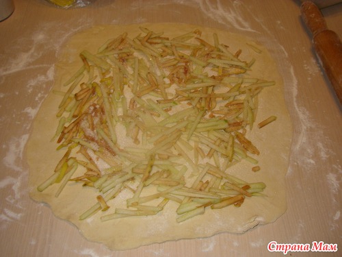 тесто тонко раскатать, яблоки мелко нарезать, я использую тёрку чуть покрупней корейской, выложить яблоки на тесто и посыпать сахаром 2-3 ст ложки