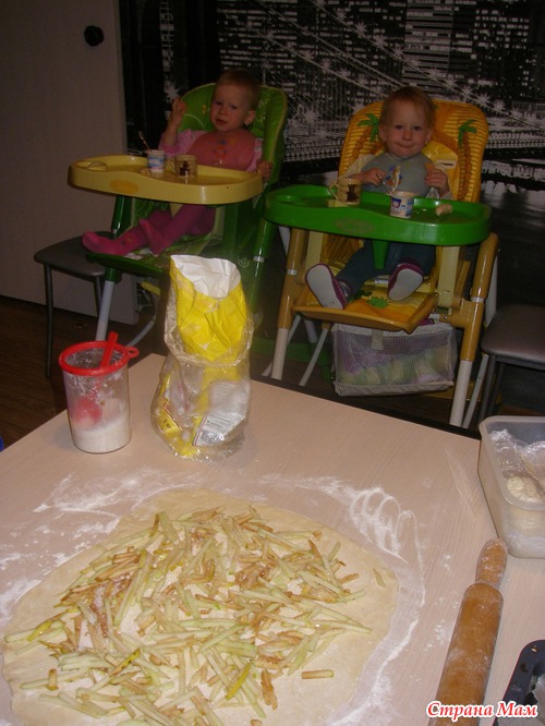 тесто тонко раскатать, яблоки мелко нарезать, я использую тёрку чуть покрупней корейской, выложить яблоки на тесто и посыпать сахаром 2-3 ст ложки