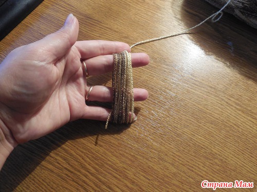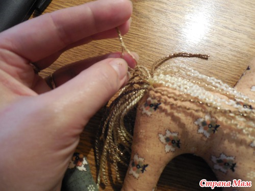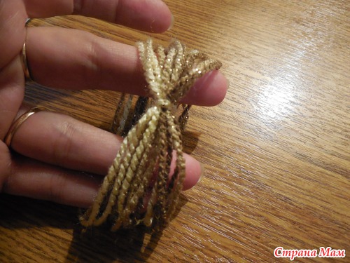 Делаем хвостик. Я взяла меланжевую пряжу. Наматываем не очень много пряжи (хотя зависит от самой пряжи, может кто-то будет использовать шерсть для валяния..) завязываем по середине, с другого конца разрезаем и пришиваем к лошадке.