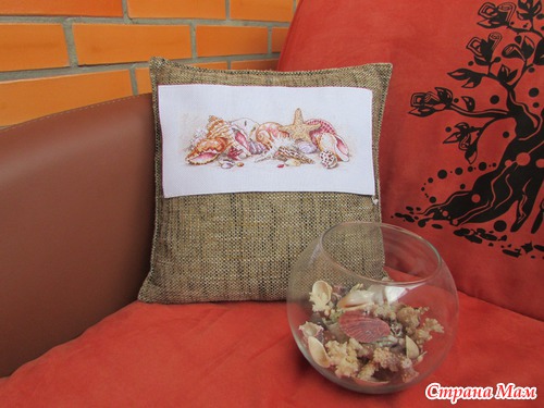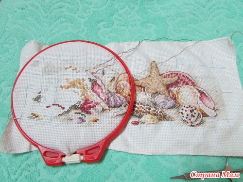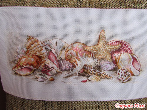Отложила в сторону "Индианку" от Ланарте и купила в магазине схему Морских сокровищ. Вышивала подбором нитками ДМС. Единственное, вышивала на белой канве (в оригинальных наборах канва кремовая). Второй раз на море я была уже с работой и увлеченно крутила фрузелки на ракушках и плела бэк на морской звезде