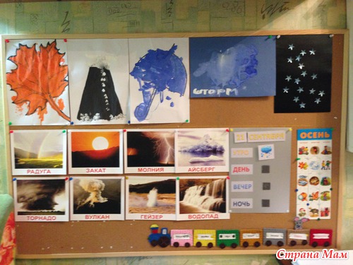 На этой неделе мы в основном рассматривали те явления природы, которые Елисею еще не знакомы: шторм, вулкан, айсберг, гейзер, ледник и др. Я ему показывала видеоролики. Что-то мы даже изображали. Ну и, естественно, пробежались по уже давно знакомым явлениям как радуга, листопад, солнышко, дождик.