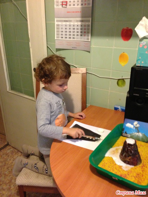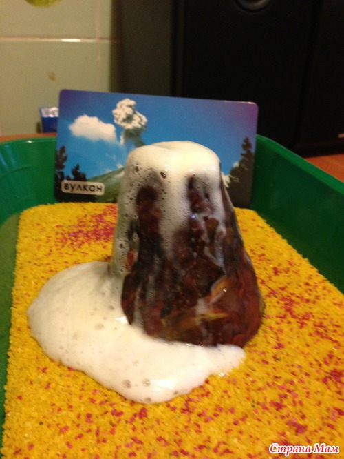 Вулкан. Лепила из пластилина. Внутри рюмка с жидким мылом, содой и уксусом. Очень впечатлило Елисея.