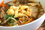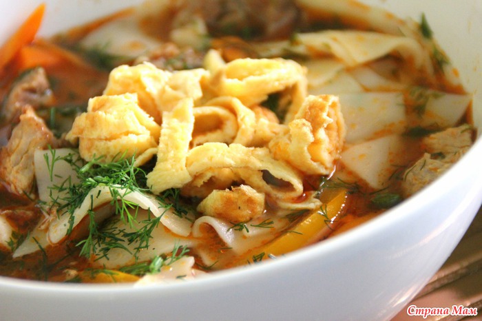 Теперь начнем "собирать" суп:в тарелку(в идеале пиалу)положить клецки, потом влить 1-2 половника тушеных овощей с мясом. Сверху положить яичную "соломку" и посыпать рубленой зеленью.