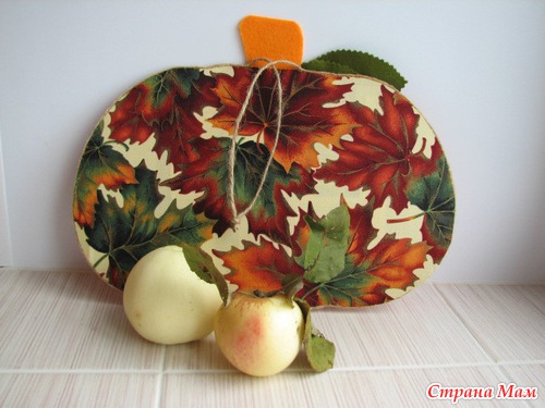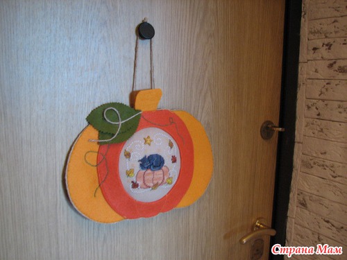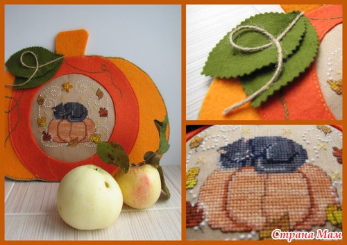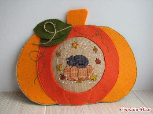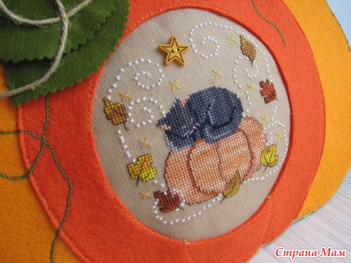 Вышивка для стабильности посажена на флизелин и вшита. Если на фото заметно, то вышивка немного выпуклая, под нее подложено несколько слоев уплотнителя. Получился приятный объем и тыква приобрела пузатый бочек.