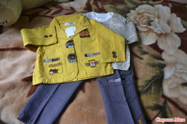 Брюки и пиджак типа из тонкой, но плотной джинсы. Толстовочка - трикотажная. Переживала из-за размера - боялась маленький придет. Просила продавца прислать сначала на рост 80см (сыну к лету), потом подумала и поменяла на 90см (т. к. уже 74-80 носим). По ощущениям пришел на наш 92-98. Ну думаю подрастем