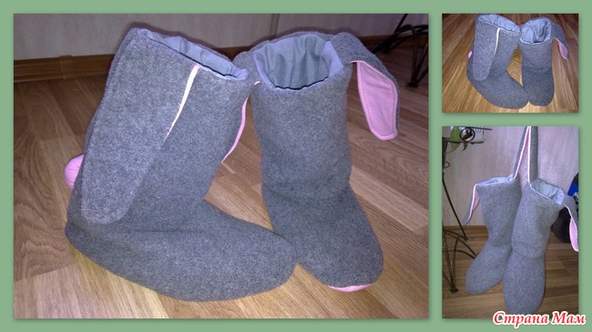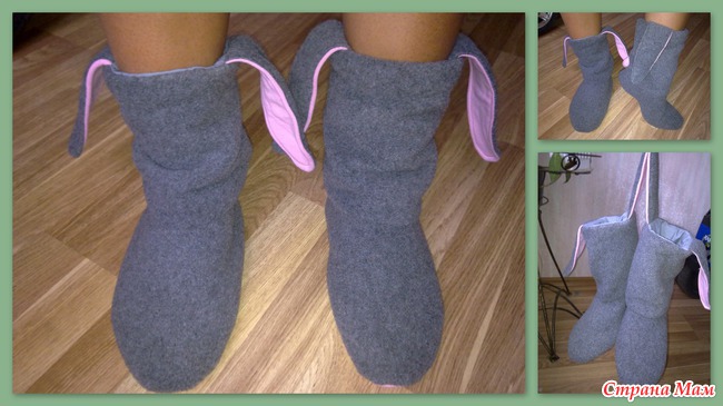 ) верхний сапожок сшит из толстого флиса, ушки и хвостики из детской футболки, внутренний сапожок из маминой юбки