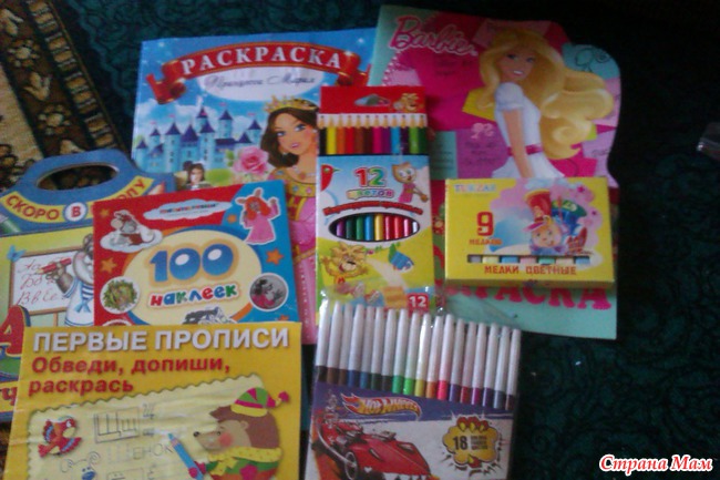 Раскраски, книжки, фломастеры, карандаши, мелки