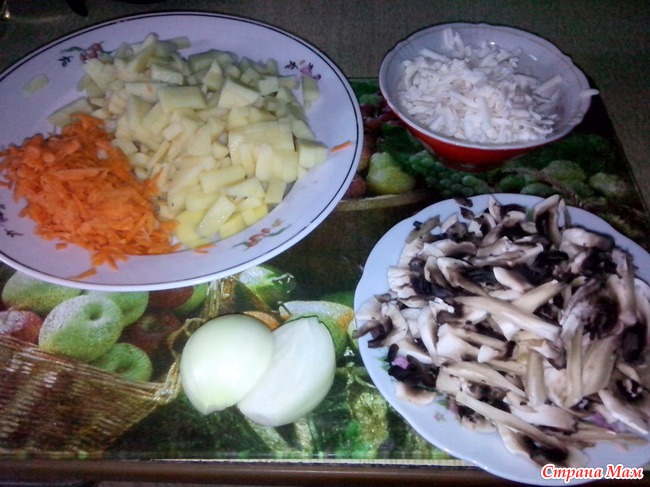 Режем картошку и трем на терку морковь. Бросаем в бульон. Пока оно там все варится режем шампиньоны и трем на терку сыр. Лук пережариваем на растительном масле.