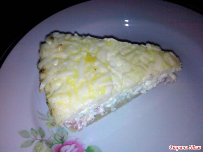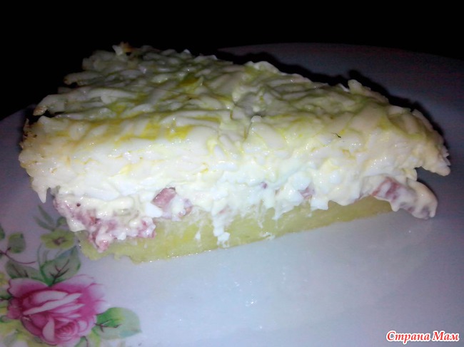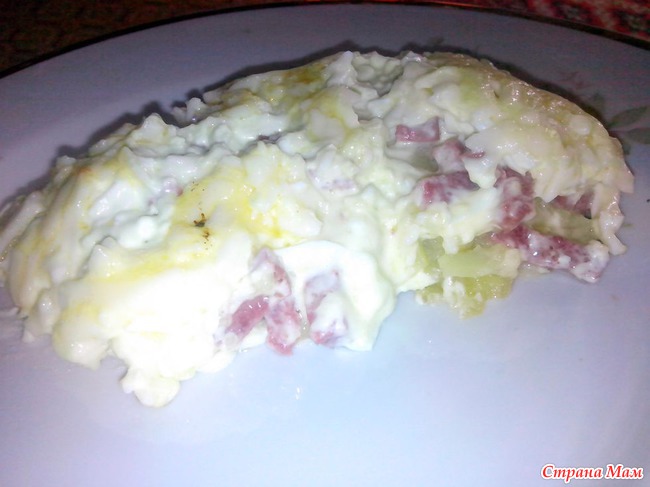Выкладываем в форму слоями, каждый слой перемазывая майонезом-картофель(посолить), колбаса, яйца, сырки. Верхний слой также смазываем майонезом и в духовку на 180 С. У меня она там пробыла 40 минут. Получилась вот такая верхушка
