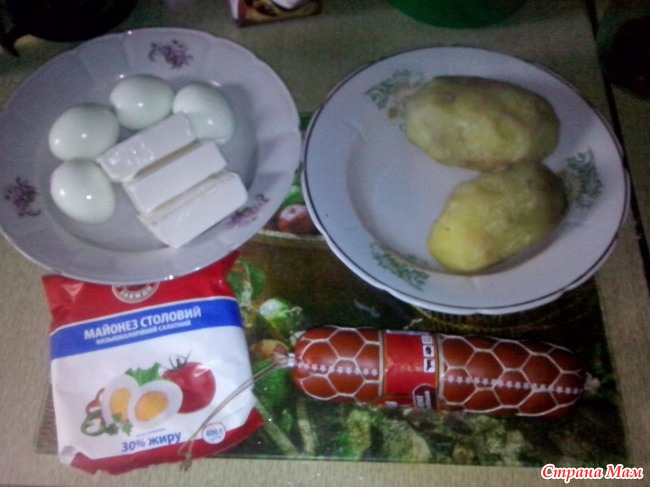 Сырки, картофель, яйца натираем на терку, а колбасу режим любимой формой.