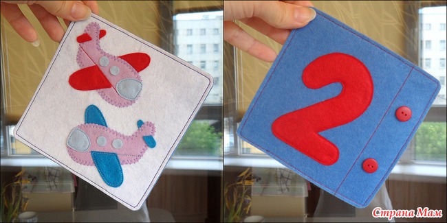 Карточки из фетра. С одной стороны - цифра и соответствующее кол-во пуговок, с другой - транспорт опять-таки в нужном количестве) так что, карточки получились мальчишеские) шила, правда, на ооочень скорую руку, поэтому не без кривоватостей)