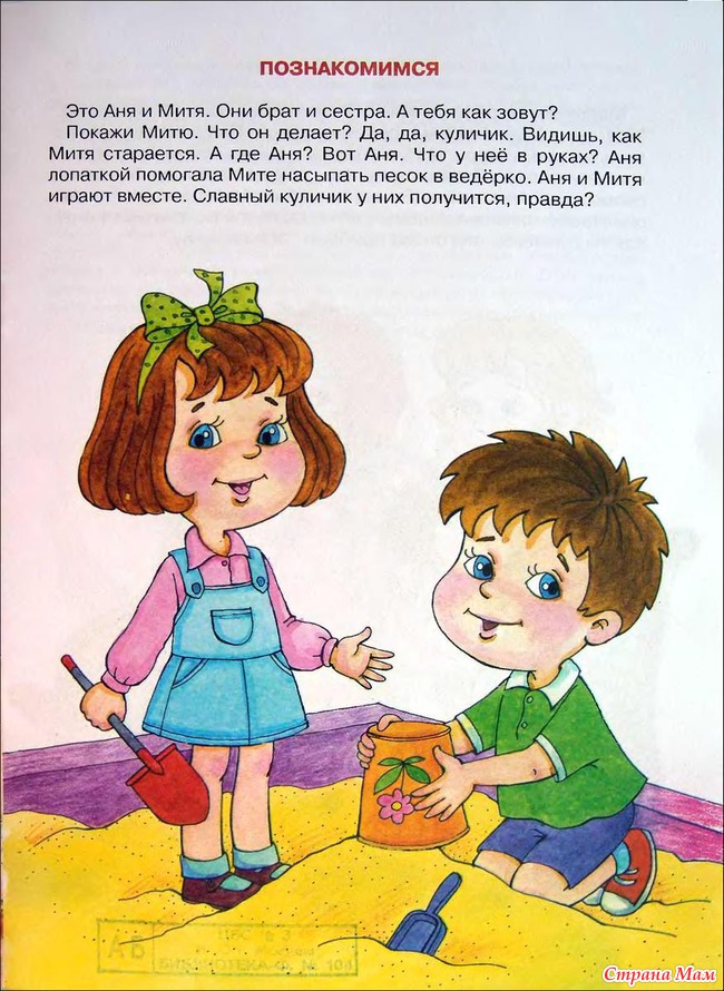 Как играть в такую игру: пусть мама будет зайкой, а ребенок мишкой. Так же мама будет автором. Мама говорит: "А мишка поделился с зайкой лопатками" и побуждает, чтоб ребенок сам произнес слова мишки: "Держи, зайка, лопатку. Давай вместе, строить." Для того, чтоб ребенок говорил, тихонечко подсказывайте ему, а дальше он сам уже проникнется и сможет говорить уже без ваших подсказок.