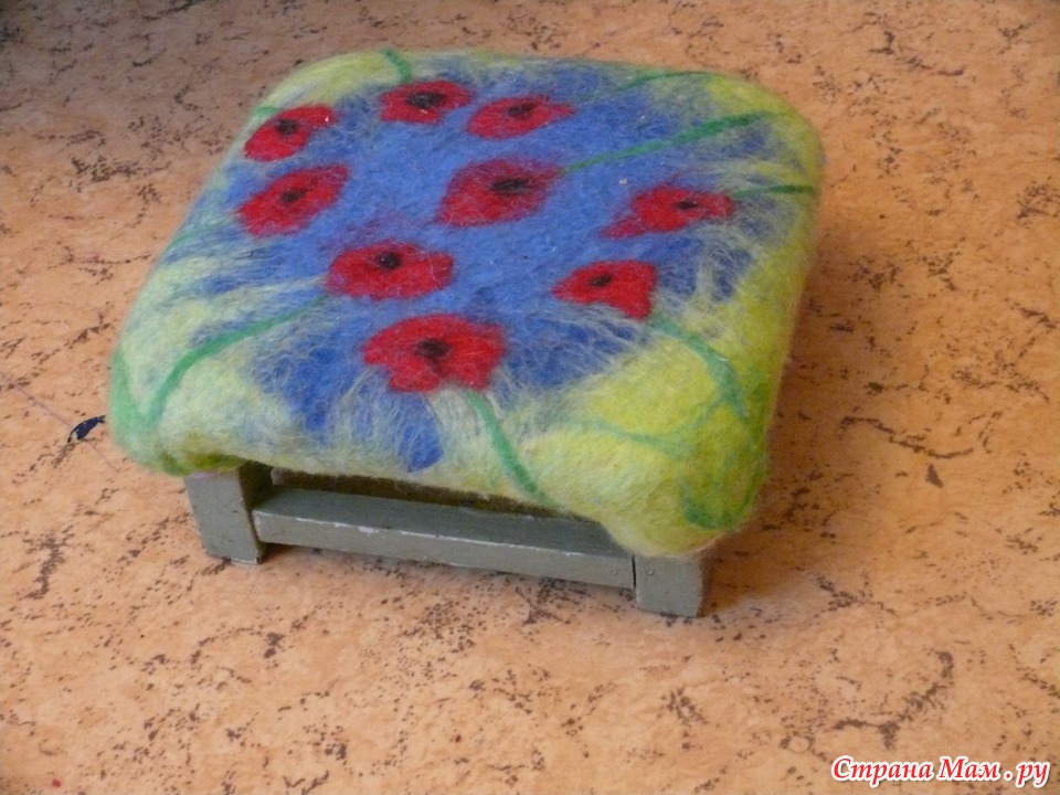 Сделала дочке стульчик, была старая табуретка с обрезанными ножками, ставить ноги, я приодела ее немного и вот на ваш суд выставляю.