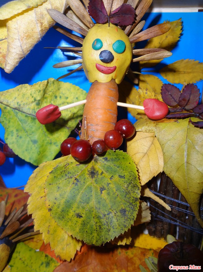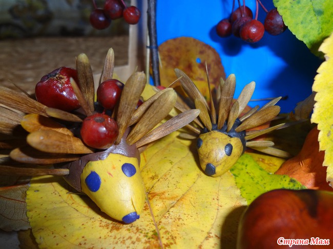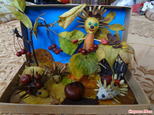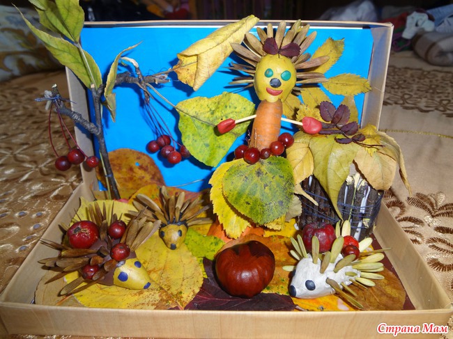 Оформление мое, дочка помогала делать ежиков, очень ей понравилось лепить им глазки и носик, а потом делать иголочки. Получилось три: мама, папа и малыш-ежик.