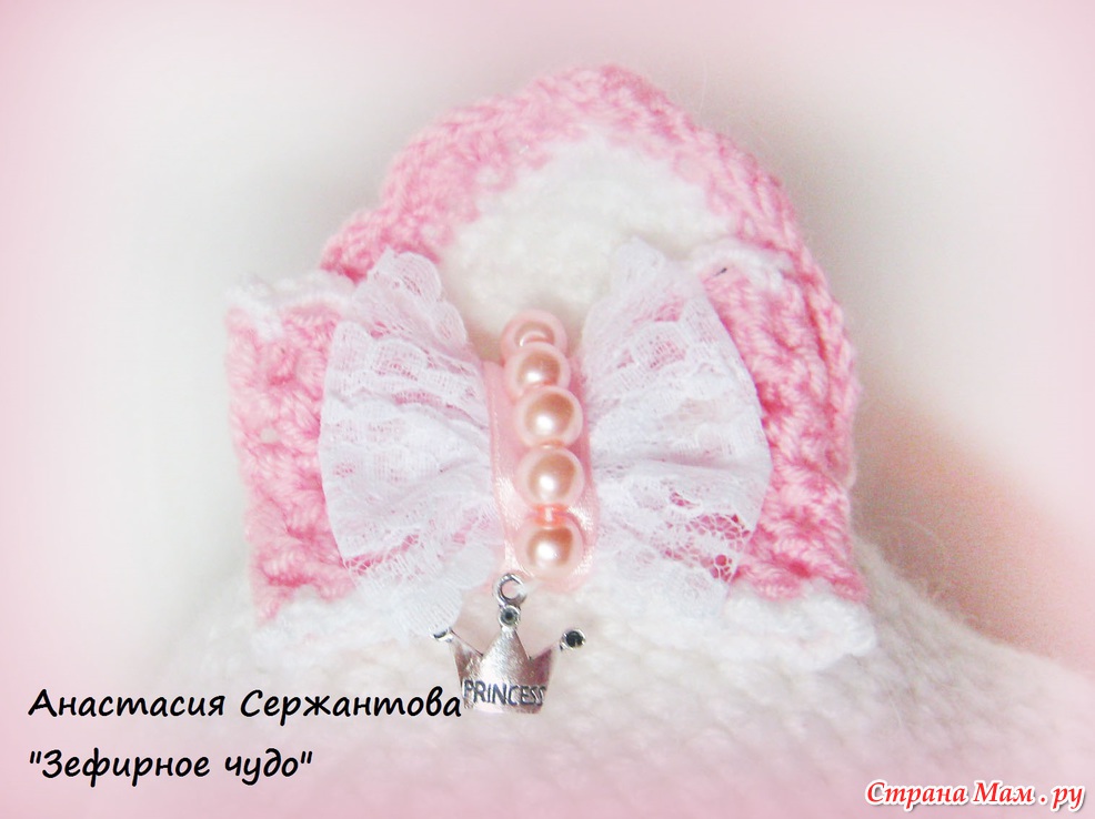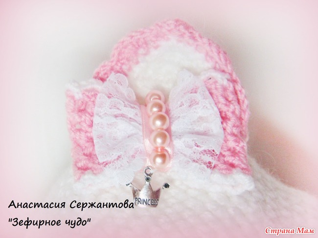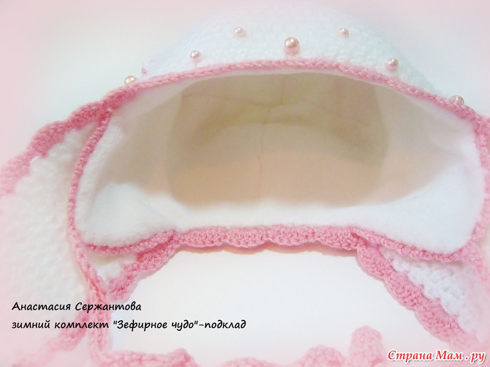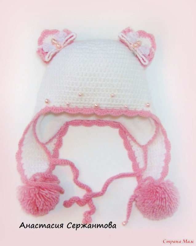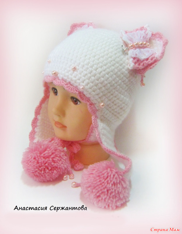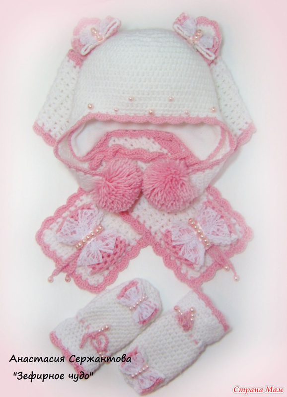 Весь комплект связан крючком из нескольких тонких нитей-ангора и полушерсть, засчет этого он мягче, чем вязаные вещи из одной толстой нити. На шапочке 2 пары нижних ушек, внутренние с вязочками и утеплены флисом. Затылок удлиннен-для наилучшей защиты от ветра и снега. Подклад флисовый. На кошачьих ушках кокетливые бантики, на одном бантике подвеска-корона с надписью-принцесса)))бантики связаны крючком, верхний слой-тончайшее кружево и чешские бусинки.