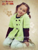 Вам потребуется: пряжа «Мягкий сюрприз» (50 % шерсть, 50 % акрил, 200 м/100 г) – 400 г салатовой и 100 г коричневой, спицы № 4,5, крючок № 4; 4 пуговицы.