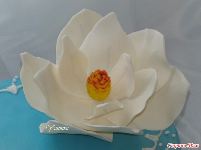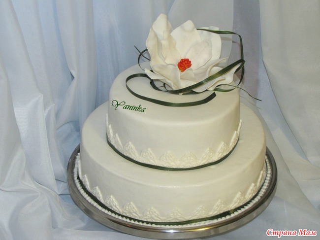 Свадебный с магнолией. 4,5 кг. 1-й ярус - классический бисквит, сливочный крем, виноград, ананасы, 2-й ярус - шифоновый бисквит, сливочный крем, персики. Этот заказ был срочным, утром позвонила моя заказчица, у сына свадьба, невеста забыла заказать торт, Яна сделай что-нибудь к 19.00. Вообщем начала я работать в 10.00 с ним, к 19-ти закончила.