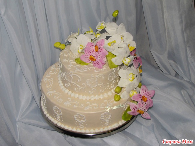 Свадебный с орхидеями. 5,3 кг. 1-й ярус - медовик, шоколад, 2-й ярус - ванильный бисквит, сливочный крем, персики.