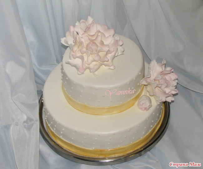 Свадебный с пионами (или их подобием )))). 5,1 кг. Ванильный бисквит, персики, виноград, ананасы, сливочный крем.