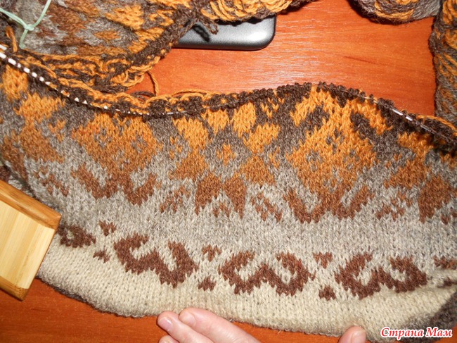 поэтому между 1 и 2 узором вставлю тонкую полоску из жаккарда и уменьшу по 14 петель