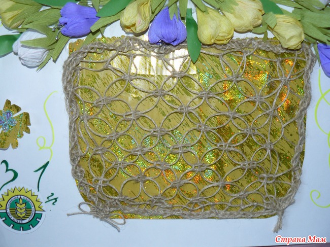 Вот так выглядит корзина ( в технике макраме и фольгированный картон)