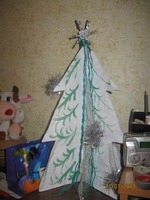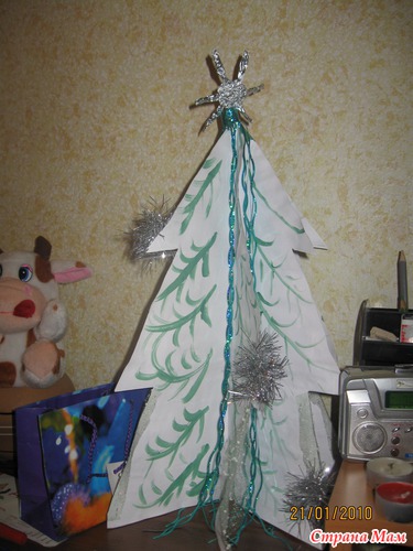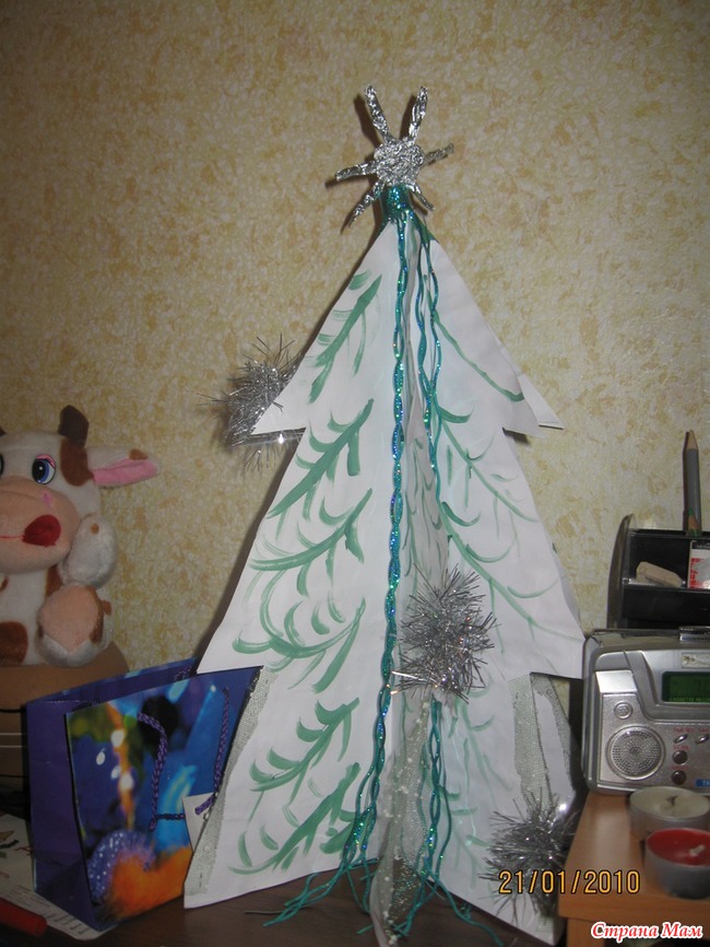 Это был сплошной креатив из того что под рукой, при помощи степлера в считанные минуты мы с дочками соорудили эту ёлочку, только бусы из фольги не прикрепились, поэтому их нет на фото!