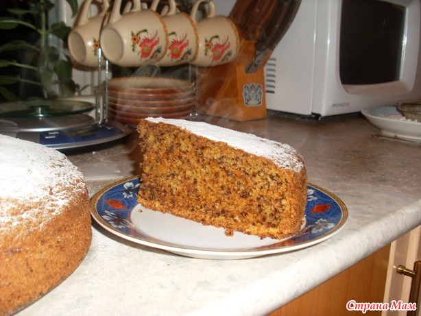 В отдельной миске смешать муку, соду и измельченные в блендере грецкие орехи. Обе массы смешать. Взбить в отдельной посуде белки до густой пены и ввести их в подготовленное тесто, перемешать. Форма для такого количества теста должна быть не менее 30 см в диаметре. Выпекать в предварительно прогретой духовке при температуре 175 град. в течение 1 часа, затем накрыть фольгой и выпекать при той же температуре еще 30 мин. Готовой выпечке дать немного остыть под фольгой (а то осядет).